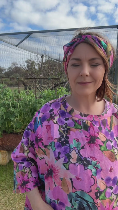 Oozing elegance and comfort, the Lyla Linen dress loosely flows with a longer length, a scooped up hemline on each side. A flattering neckline with raw frayed edging, 3/4 length sleeves and 2 inseam pockets and is a one size fits all. You will love the floaty feeling when you wear the Lyla linen dress which you can also accessorise with the silk scarf, sold separately, (as suggested in images) in the same design as a head scarf or use the scarf to pull in at the waist as a belt. Lyla Linen is available in variety of different pattern designs of which the hardest decision will be choosing which one!